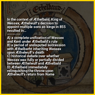 The Vikings were not a major threat to Wessex during Æthelwulf's reign. In 843, he was defeated in a battle against the Vikings at Carhampton in Somerset, but he achieved a major victory at the Battle of Aclea in 851. In 853, he joined a successful Mercian expedition to Wales to restore the traditional Mercian hegemony, and in the same year, his daughter Æthelswith married King Burgred of Mercia. In 855, Æthelwulf went on a pilgrimage to Rome. In preparation he gave a "decimation", donating a tenth of his personal property to his subjects; he appointed his eldest surviving son Æthelbald to act as King of Wessex in his absence, and his next son Æthelberht to rule Kent and the south-east. Æthelwulf spent a year in Rome, and on his way back he married Judith, the daughter of the West Frankish king Charles the Bald.
