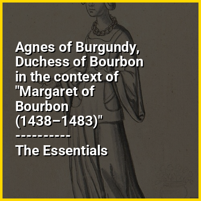 Agnes of Burgundy (1407 – 1 December 1476), duchess of Bourbon (Bourbonnais) and Auvergne, countess of Clermont, was the daughter of John the Fearless (1371–1419) and Margaret of Bavaria. Her maternal grandparents were Albert I, Duke of Bavaria and Margaret of Brieg. Her paternal grandparents were Philip the Bold and Margaret III, Countess of Flanders.