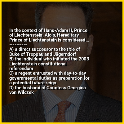 Alois, Hereditary Prince of Liechtenstein (Alois Philipp Maria; born 11 June 1968) is the eldest son of Hans-Adam II, Prince of Liechtenstein, and Countess Marie Kinsky von Wchinitz und Tettau, and the heir apparent to the throne of Liechtenstein. Alois has been regent of the country since 15 August 2004, while his father remains the official head of state.