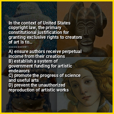 ⭐ In the context of United States copyright law, the primary constitutional justification for granting exclusive rights to creators of art is to…
