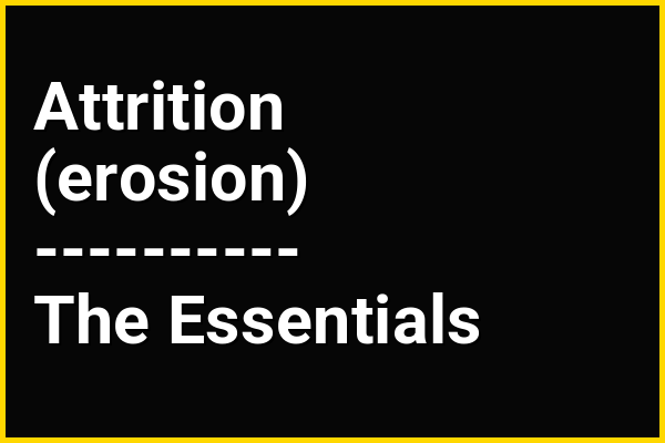 Abrasion, under its strictest definition, is commonly confused with attrition and sometimes hydraulic action however, the latter less commonly so. Both abrasion and attrition refers to the wearing down of an object. Abrasion occurs as a result of two surfaces rubbing against each other, resulting in the wearing down of one or both of the surfaces. However, attrition refers to the breaking off of particles (erosion) which occurs as a result of objects hitting against each other. Abrasion leads to surface-level destruction over a period of time, whereas attrition results in more change at a faster rate. Today, the geomorphology community uses the term "abrasion" in a looser way, often interchangeably with the term "wear".