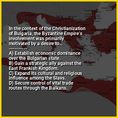 ⭐ In the context of the Christianization of Bulgaria, the Byzantine Empire’s involvement was primarily motivated by a desire to…