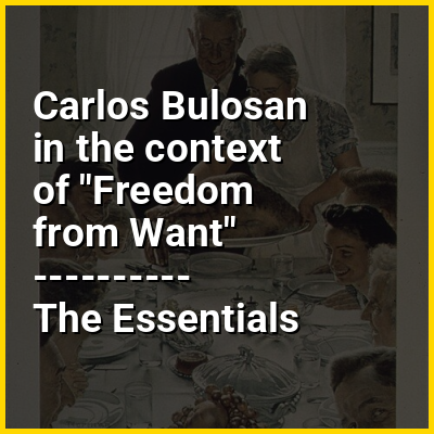 Freedom from Want was painted in November 1942 and published in the March 6, 1943, issue of The Saturday Evening Post. All of the people in the picture were friends and family of Rockwell in Arlington, Vermont, who were photographed individually and painted into the scene. The work depicts a group of people gathered around a dinner table for a holiday meal. Having been partially created on Thanksgiving to depict the celebration, it has become an iconic representation for Americans of Thanksgiving and family holiday gatherings in general. The Post published Freedom from Want with a corresponding essay by Carlos Bulosan as part of the Four Freedoms series. Despite many who endured sociopolitical hardships abroad, Bulosan's essay spoke on behalf of those enduring the socioeconomic hardships domestically, and it thrust him into prominence.