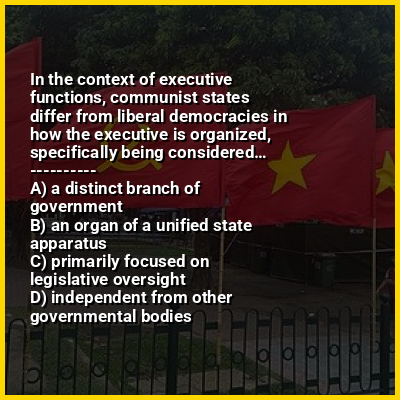 The executive is the part of the government that executes or enforces the law. It can be organised as a branch of government, as in liberal democracies, or as an organ of the unified state apparatus, as is the case in communist states.