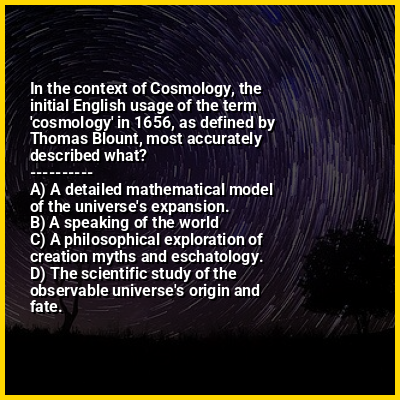 ⭐ In the context of Cosmology, the initial English usage of the term 'cosmology' in 1656, as defined by Thomas Blount, most accurately described what?