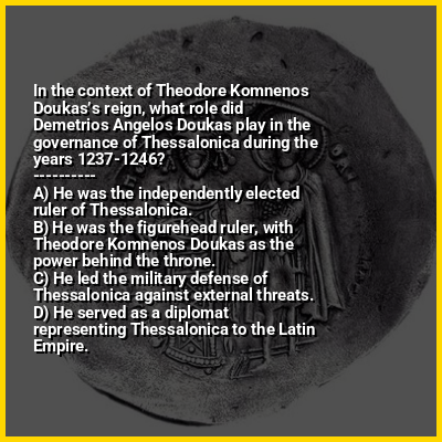 Theodore Komnenos Doukas (Greek: Θεόδωρος Κομνηνὸς Δούκας, Theodōros Komnēnos Doukas; Latinized as Theodore Comnenus Ducas; died c. 1253) or Theodore Angelos Komnenos was the ruler of Epirus and Thessaly from 1215 to 1230 and of Thessalonica and most of Macedonia and western Thrace from 1224 to 1230. He was also the power behind the rule of his sons John and Demetrios over Thessalonica in 1237–1246.