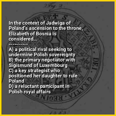 Daughter of Ban Stephen II of Bosnia, Elizabeth became Queen of Hungary upon marrying King Louis I the Great in 1353. In 1370, she gave birth to a long-anticipated heir, Catherine, and became Queen of Poland when Louis ascended the Polish throne. The royal couple had two more daughters, Mary and Hedwig, but Catherine died in 1378. Initially a consort with no substantial influence, Elizabeth then started surrounding herself with noblemen loyal to her, led by her favourite, Nicholas I Garai. When Louis died in 1382, Mary succeeded him with Elizabeth as regent. Unable to preserve the personal union of Hungary and Poland, Elizabeth secured the Polish throne for her youngest daughter, Hedwig.
