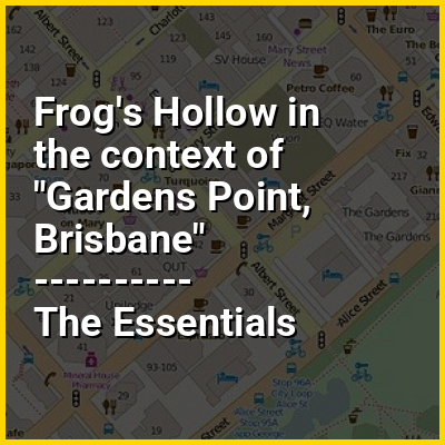 Gardens Point is the southernmost area of the peninsula that forms the central business district of Brisbane, Queensland, Australia. It is located immediately south of Alice Street and is bounded by the Brisbane River on its other three sides. Historically a convict farm that supplied a variety of food crops for the fledgling Moreton Bay Penal Settlement, Gardens Point would eventually become an experimental botanical reserve, and then gardens and parkland for the citizens of Brisbane. It is also a hub of politics and education, hosting important institutions such as the Parliament of Queensland and the chancellery and inner-city campus of the Queensland University of Technology. Frog's Hollow is a historic neighbourhood which lies immediately to the north of Gardens Point, and consists of the six or so city blocks bounded by Charlotte, Edward, Alice and George streets. It forms the lower part of the Brisbane CBD, which occupies the rest of the peninsula and some adjacent areas.