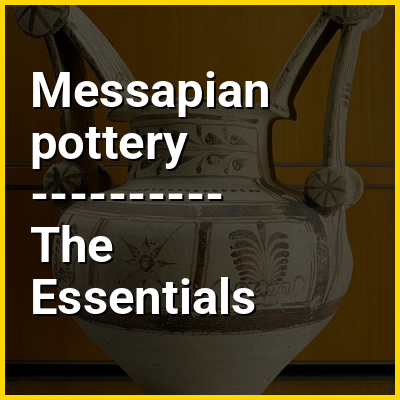 Messapian pottery is a type of Messapian ceramic, produced between the 7th century BC until the 3rd century BC on the Italian region of southern Apulia. Messapian pottery was made by the Messapii, an ancient people inhabiting the heel of Italy since around 1000 BC, who migrated from Crete and Illyria. Messapian pottery consisted first primarily, with geometric patterns like circles, squares, diamonds, horizontal dash patterns, swastika and other similar motifs. Late through Greek influence the meander was added. From about the beginning of the 5th century BC again under Greek influence, with imports of Attic pottery, figurative decoration was added. In addition, leaf motifs, new elements such as ivy and other repertoire were included. Up to then only fragments of the pottery was decorated in contrast to the whole surface being decorated after the 5th century BC. In the fourth century BC, the artists came back again to geometric ornamentation, but by then the ceramics were almost completely under Greek influence.