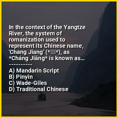 ⭐ In the context of the Yangtze River, the system of romanization used to represent its Chinese name, 'Chang Jiang' (*长江*), as *Cháng Jiāng* is known as…