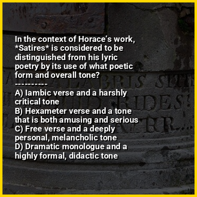 The Satires (Latin: Saturae or Sermones) is a collection of satirical poems written in Latin dactylic hexameters by the Roman poet Horace. Published probably in 35 BC and at the latest, by 33 BC, the first book of Satires represents Horace's first published work. It established him as one of the great poetic talents of the Augustan Age. The second book was published in 30 BC as a sequel.