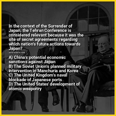 ⭐ In the context of the Surrender of Japan, the Tehran Conference is considered relevant because it was the site of secret agreements regarding which nation's future actions towards Japan?