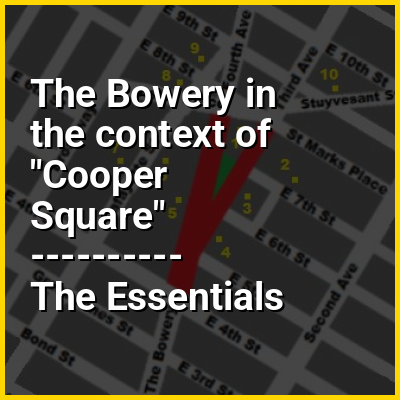 The Bowery (/ˈbaʊəri/) is a street and neighborhood in Lower Manhattan in New York City, New York. The street runs from Chatham Square at Park Row, Worth Street, and Mott Street in the south to Cooper Square at 4th Street in the north. The eponymous neighborhood runs roughly from the Bowery east to Allen Street and First Avenue, and from Canal Street north to Cooper Square/East Fourth Street. The neighborhood roughly overlaps with Little Australia. To the south is Chinatown, to the east are the Lower East Side and the East Village, and to the west are Little Italy and NoHo. It has historically been considered a part of the Lower East Side of Manhattan.
