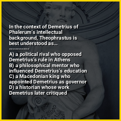 Demetrius of Phalerum (also Demetrius of Phaleron or Demetrius Phalereus; Ancient Greek: Δημήτριος ὁ Φαληρεύς; c. 350 – c. 280 BC) was an Athenian orator originally from Phalerum, an ancient port of Athens. A student of Theophrastus, and perhaps of Aristotle, he was one of the first members of the Peripatetic school of philosophy. Demetrius had been a distinguished statesman who was appointed by Cassander, the King of Macedon, to govern Athens, where Demetrius ruled as sole ruler for ten years. During this time, he introduced important reforms of the legal system, while also maintaining pro-Cassander oligarchic rule.