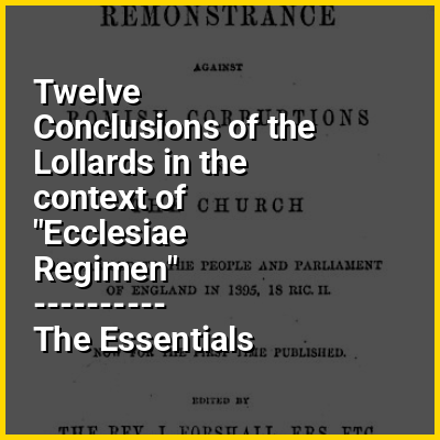 The Twelve Conclusions of the Lollards is a Middle English religious text written in 1395 containing statements by leaders of the English medieval movement, the Lollards, inspired by some of the teachings of John Wycliffe. The text was presented to the Parliament of England and nailed to the doors of Westminster Abbey and St Paul's Cathedral as a placard (a typical medieval method for publishing). The manifesto suggests the expanded treatise Thirty-Seven Conclusions (Thirty-seven Articles against Corruptions in the Church), for those that wished more in-depth information.