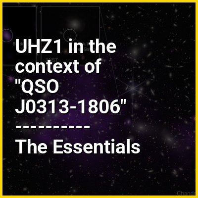 QSO J0313−1806 was the most distant, and hence also the oldest known quasar at z = 7.64, at the time of its discovery. In January 2021, it was identified as the most redshifted (highest z) known quasar, with the oldest known supermassive black hole (SMBH) at (1.6±0.4)×10 solar masses. The 2021 announcement paper described it as "the most massive SMBH at z > 7". This quasar beat the prior recordsetting quasar, ULAS J1342+0928. In 2023, UHZ1 was discovered, setting a new record for most distant quasar, eclipsing that of QSO J0313−1806.