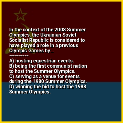 ⭐ In the context of the 2008 Summer Olympics, the Ukrainian Soviet Socialist Republic is considered to have played a role in a previous Olympic Games by…